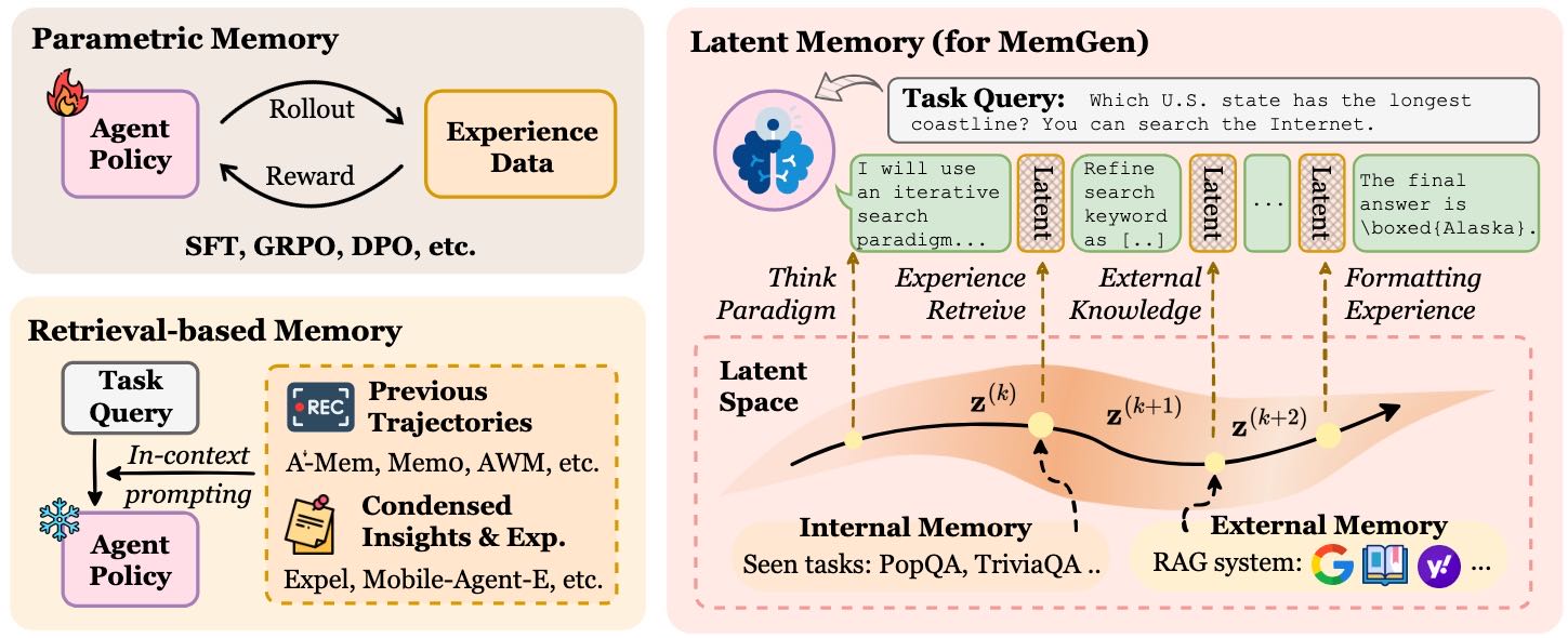Latent Memory: 指的是一种利用潜在状态(latent states)作为机器原生、高密度载体的记忆形式。它通过在模型的潜在空间中编码和表示经验,提供了一种比传统参数记忆或检索记忆更具柔性、更高效的记忆机制。MemGen 框架的核心就是利用这种潜在记忆。