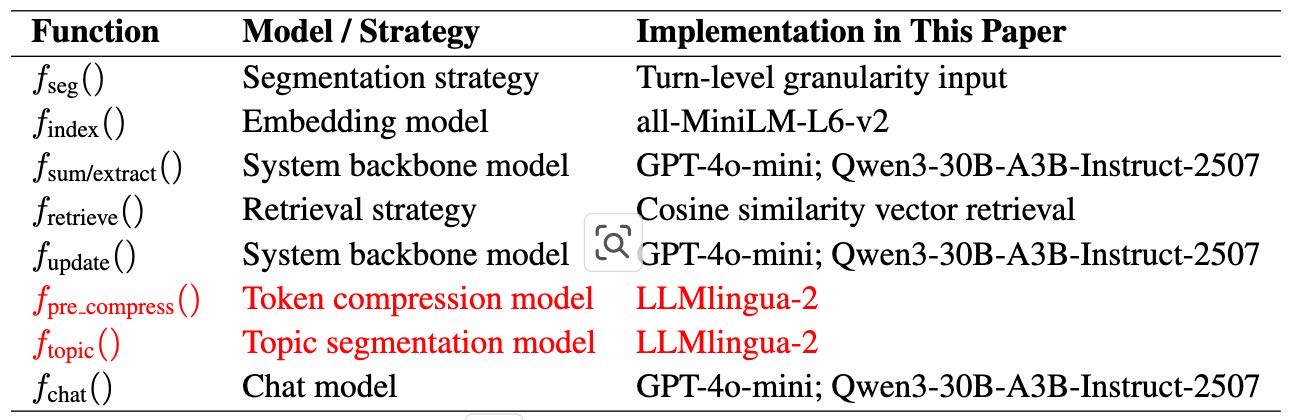 Mem0(Chhikara 等, 2025):通过全局摘要与近期上下文结合的方式提取记忆,并通过 LLM 引导的操作进行维护。