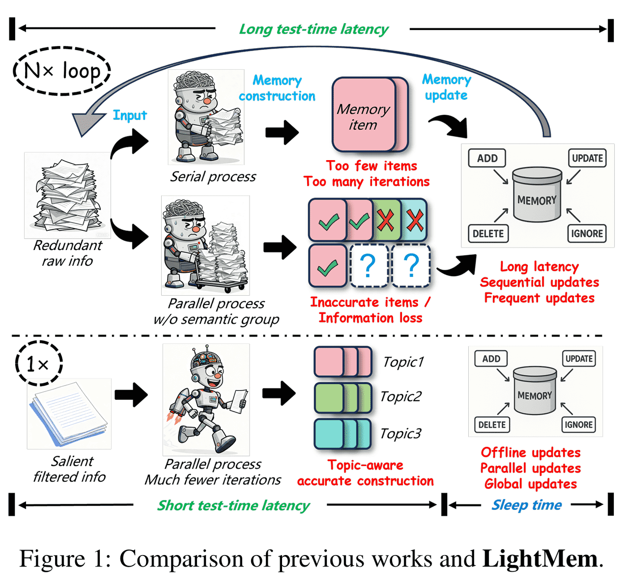 带“睡眠更新”的长期记忆:采用离线方式更新长期记忆,将记忆巩固过程与在线推理解耦,降低实时开销。
