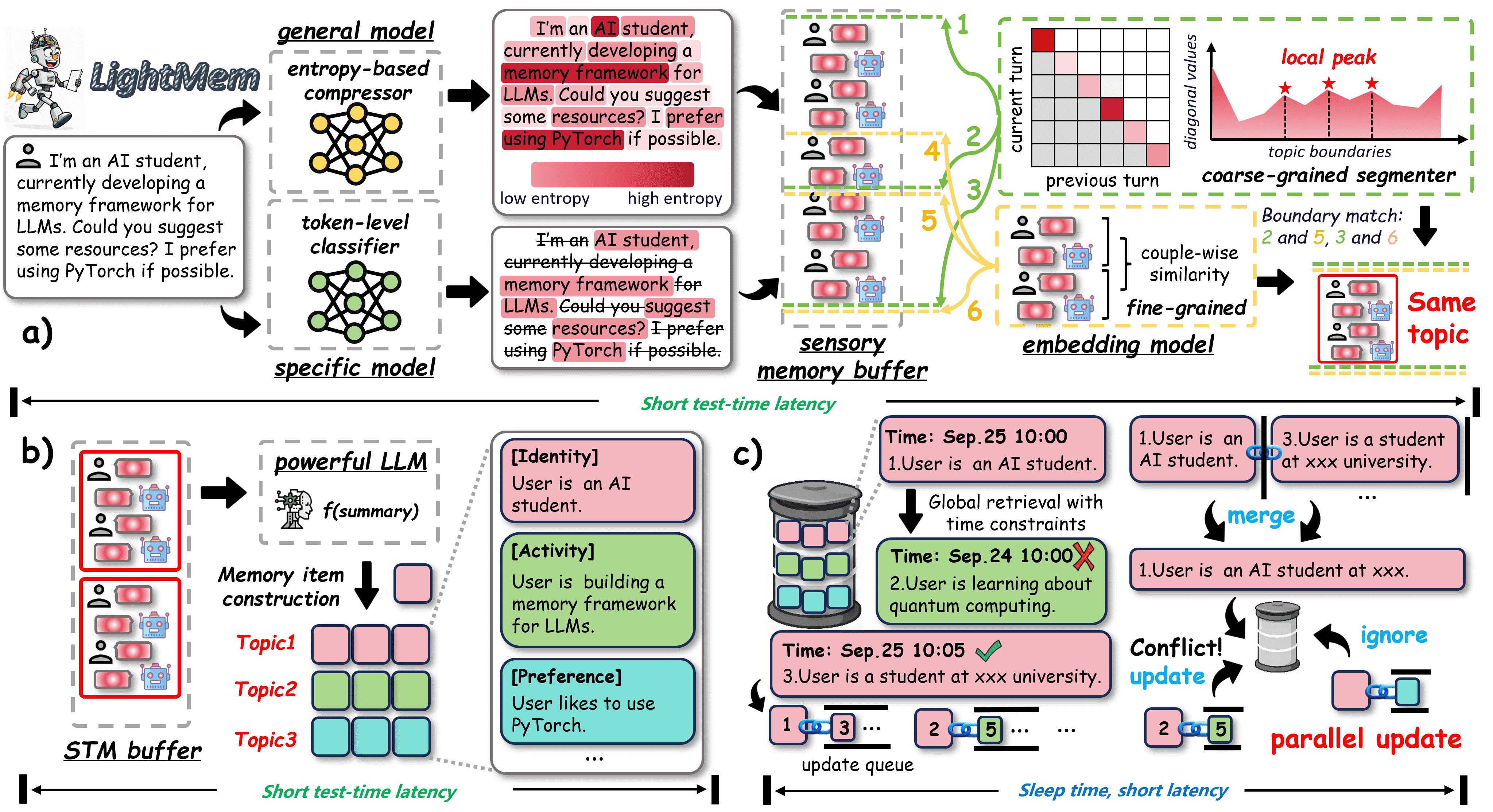 Figure 2:The LightMem architecture. LightMem consists of three modules: a) An efficient Sensory Memory Module, b) a topic aware STM Module, and c) an LTM module updated in sleep time.