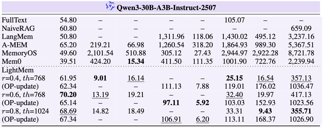 然而,现有的记忆系统往往带来较大的时间和计算开销。为此,作者提出了一种新的高效记忆系统——LightMem,在性能与效率之间取得了良好平衡。