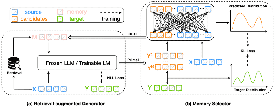 Dual problem: 是本文提出的一个核心思想,它是“primal problem”的对偶。该思想认为,“更好的生成也会促进更好的记忆”。即,模型自身生成的更优输出,可以作为下一轮生成过程中更优质的记忆。