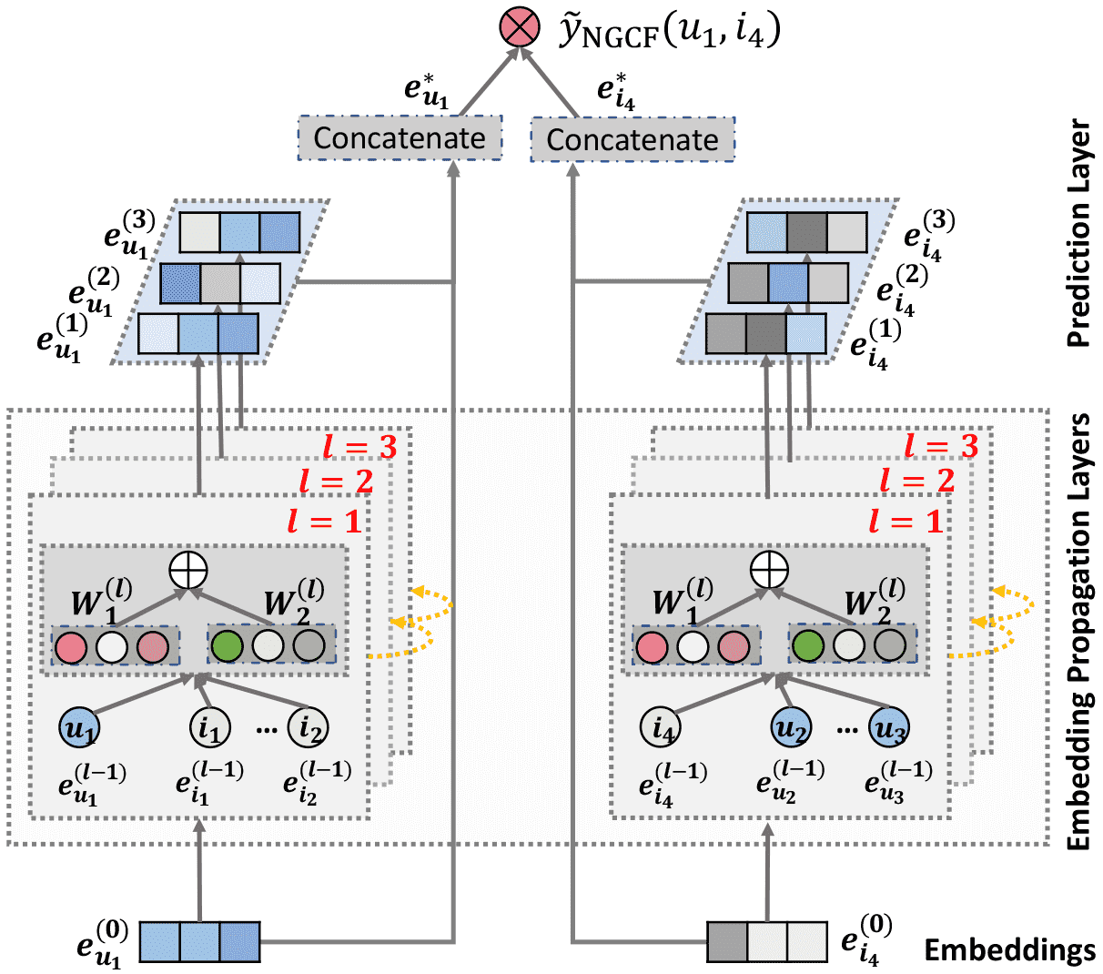 NGCF 框架:利用图结构,通过在用户-物品图上传播嵌入信息,从而学习用户和物品的表示。