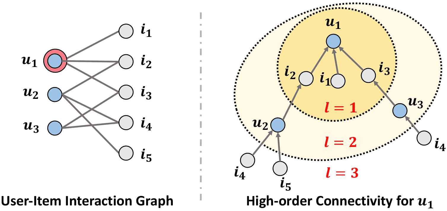 解决方案:利用用户-物品交互图中天然的高阶连接(High-order Connectivity) 来编码协同信号。