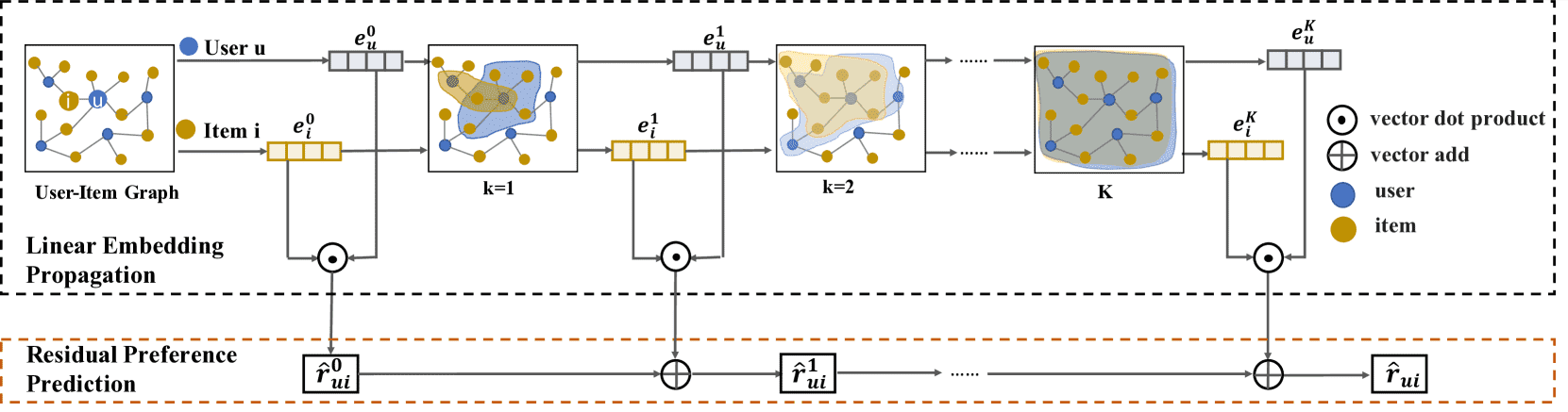 残差偏好预测(Residual Preference Prediction):不直接使用最后一层的输出来预测用户偏好,而是将每一层学到的新信息作为“残差”逐步累加,有效利用了浅层和深层的信息,缓解了过度平滑。
