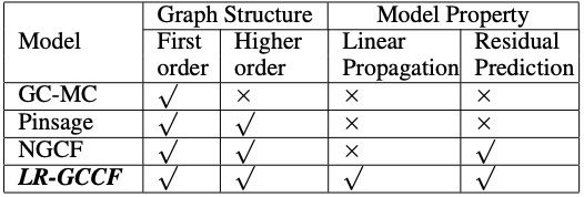 NGCF:使用了高阶邻居和非线性传播,也使用了残差预测(即拼接各层嵌入)。LR-GCCF 的关键区别在于线性传播,并对此给出了详细的理论和实证解释。