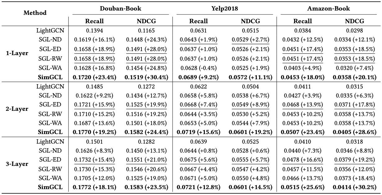 SimGCL 在 Recall 和 NDCG 指标上均优于现有方法;