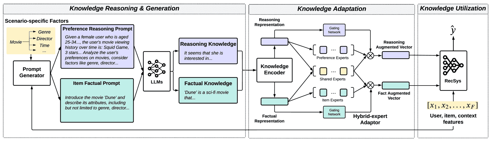 目的:让推荐模型在做决策时,不仅能参考它自己学到的“域内知识”(如协同过滤信号),还能参考LLM提供的“开放世界知识”,从而做出更精准、更个性化的推荐。