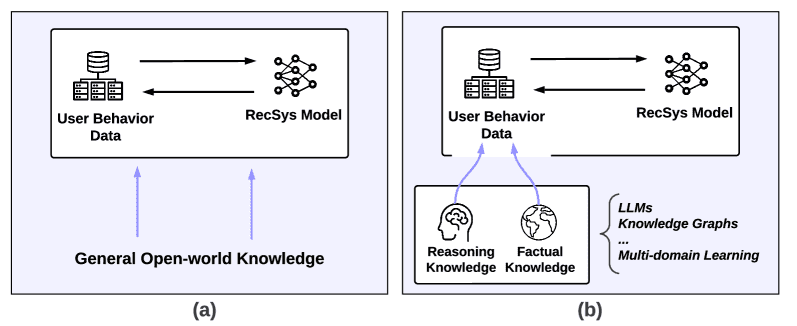 通过图1的对比可以看出,传统推荐系统(图1a)仅限于封闭的数据环境,而开放世界推荐系统(图1b)则主张系统应主动从外部世界获取知识,以提升推荐质量与泛化能力。这种外部知识主要包括两类: