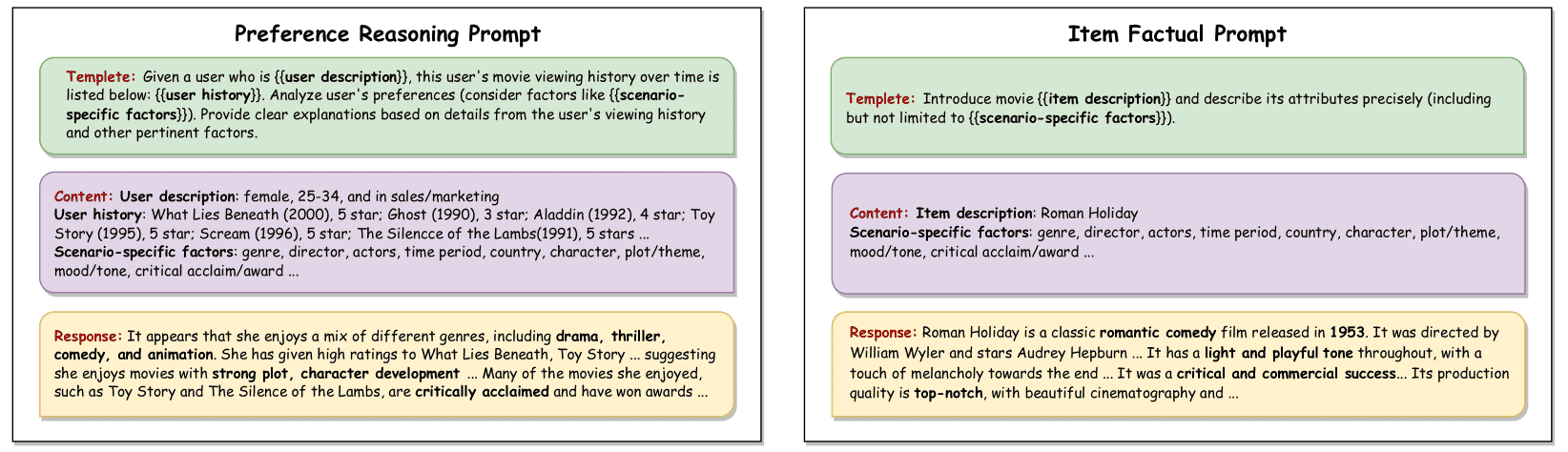 通过因子分解提示(Factorization Prompting),把问题拆解成多个关键因素(如电影推荐中的“类型”、“演员”、“导演”、“主题”等)。然后针对每个因素,让LLM提供两样东西: