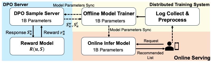 通过 RM 评估生成结果质量,并使用 DPO 进行偏好对齐,使模型在迭代中不断优化推荐效果。