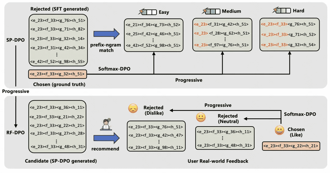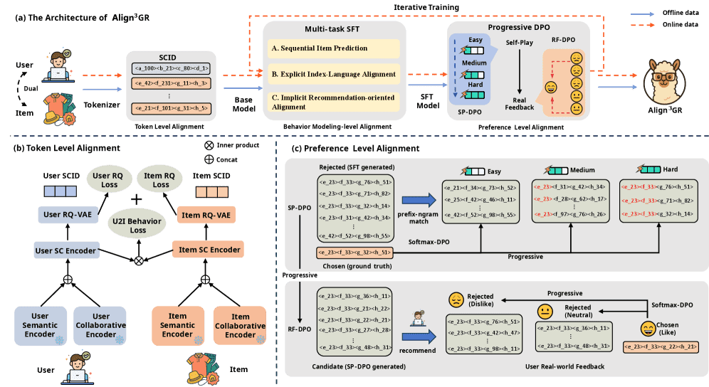 🚀 为实现偏好对齐,Align3GR 采用渐进式 DPO (Direct Preference Optimization) 策略,结合 Self-Play (SP-DPO) 和 Real-world Feedback (RF-DPO) 以适应动态用户偏好,并在离线和在线实验中均实现了显著的性能提升。