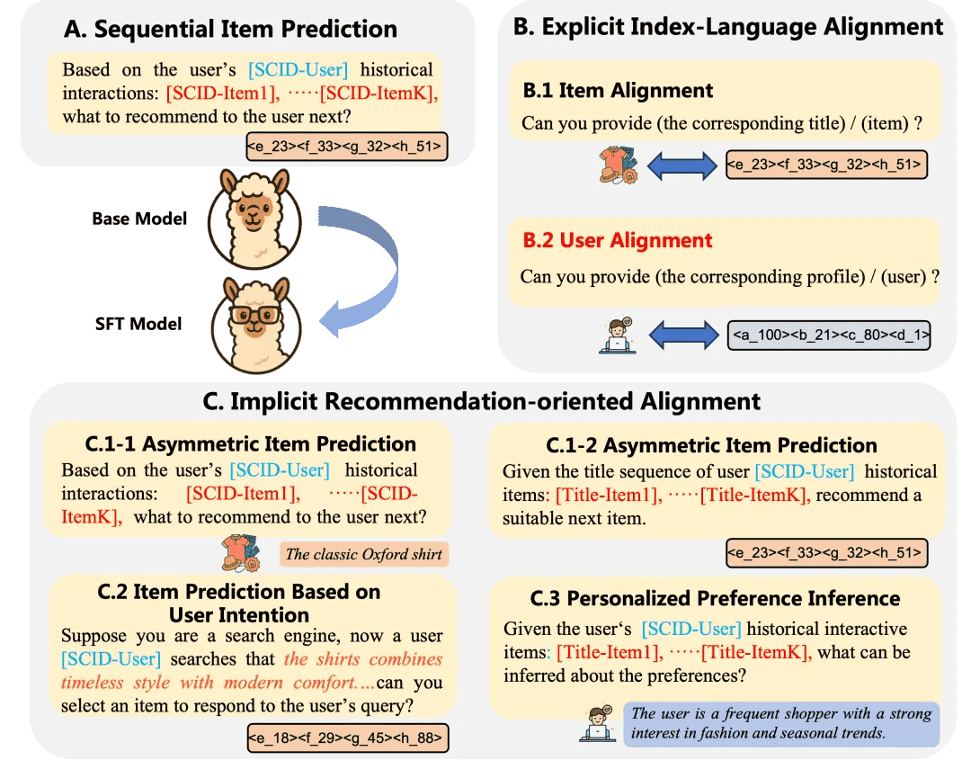 词汇扩展: 将用户和物品的SCID Token纳入LLM的词汇表,避免OOD (out-of-vocabulary) 问题。