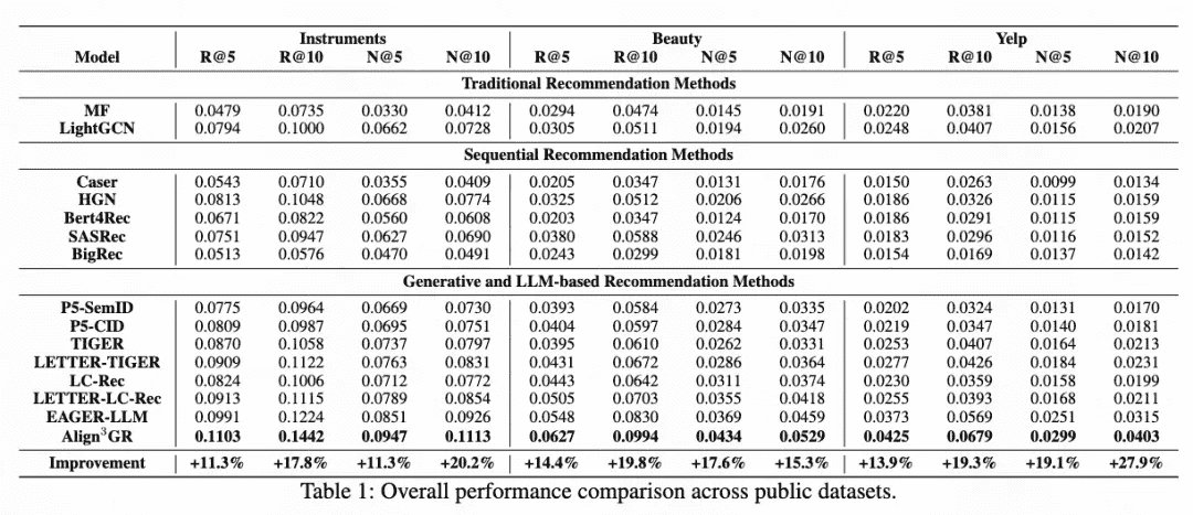 Align3GR 在多个公开数据集(Instruments、Beauty、Yelp)上的推荐性能显著优于传统推荐、序列推荐、生成式与 LLM-based 推荐方法。