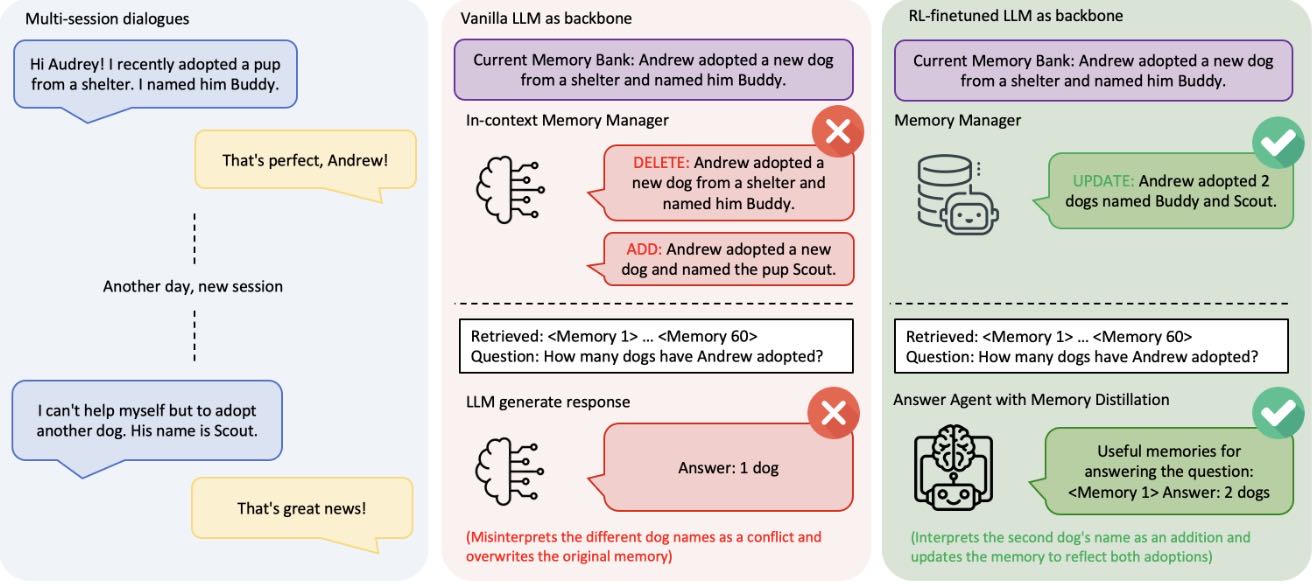 🧠 Memory-R1引入了一个基于强化学习(RL)的框架,通过训练Memory Manager和Answer Agent,使大型语言模型(LLMs)能够主动管理和利用外部记忆。
