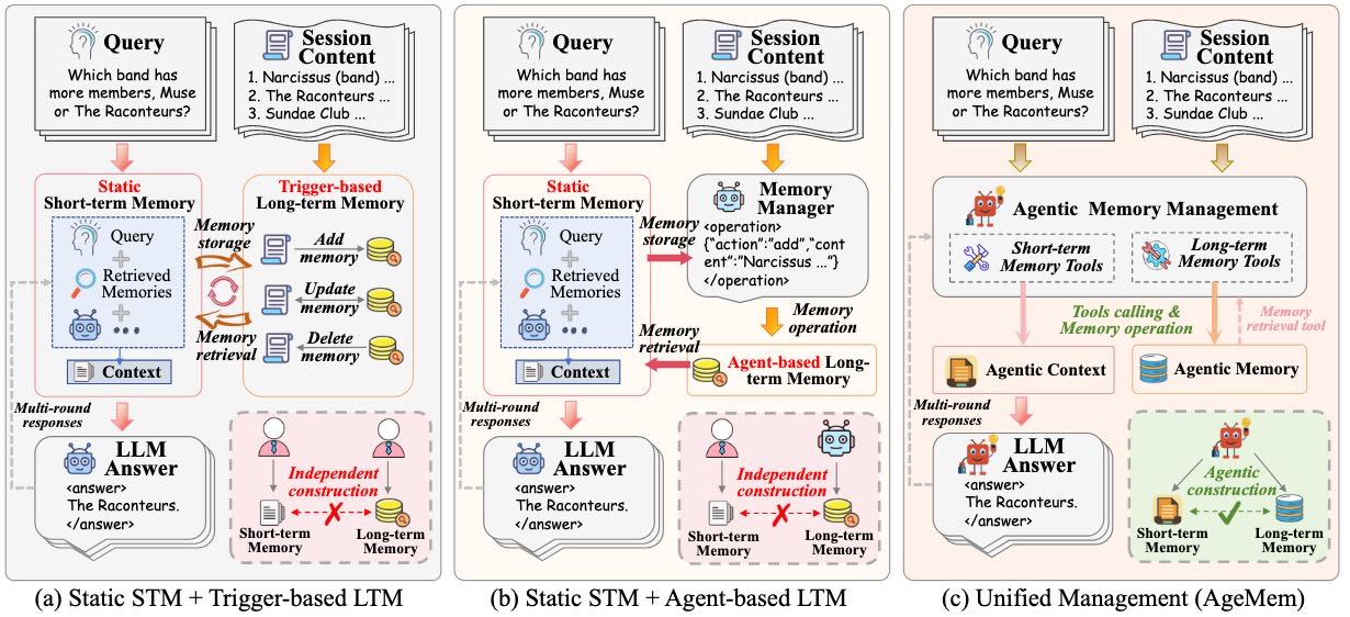 Agentic Memory: AgeMem 是一个统一的框架,旨在将大型语言模型 (LLM) 代理的长期记忆 (LTM) 和短期记忆 (STM) 管理直接整合到代理的决策策略中。它通过将记忆操作(如存储、检索、更新、总结或丢弃信息)公开为代理可调用的工具(tools)来实现这一点,从而使 LLM 代理能够自主地学习何时、何地以及如何执行这些记忆管理动作。这种统一的方法旨在克服现有系统中 LTM 和 STM 分离带来的局限性,从而实现端到端的优化和更灵活的记忆控制。