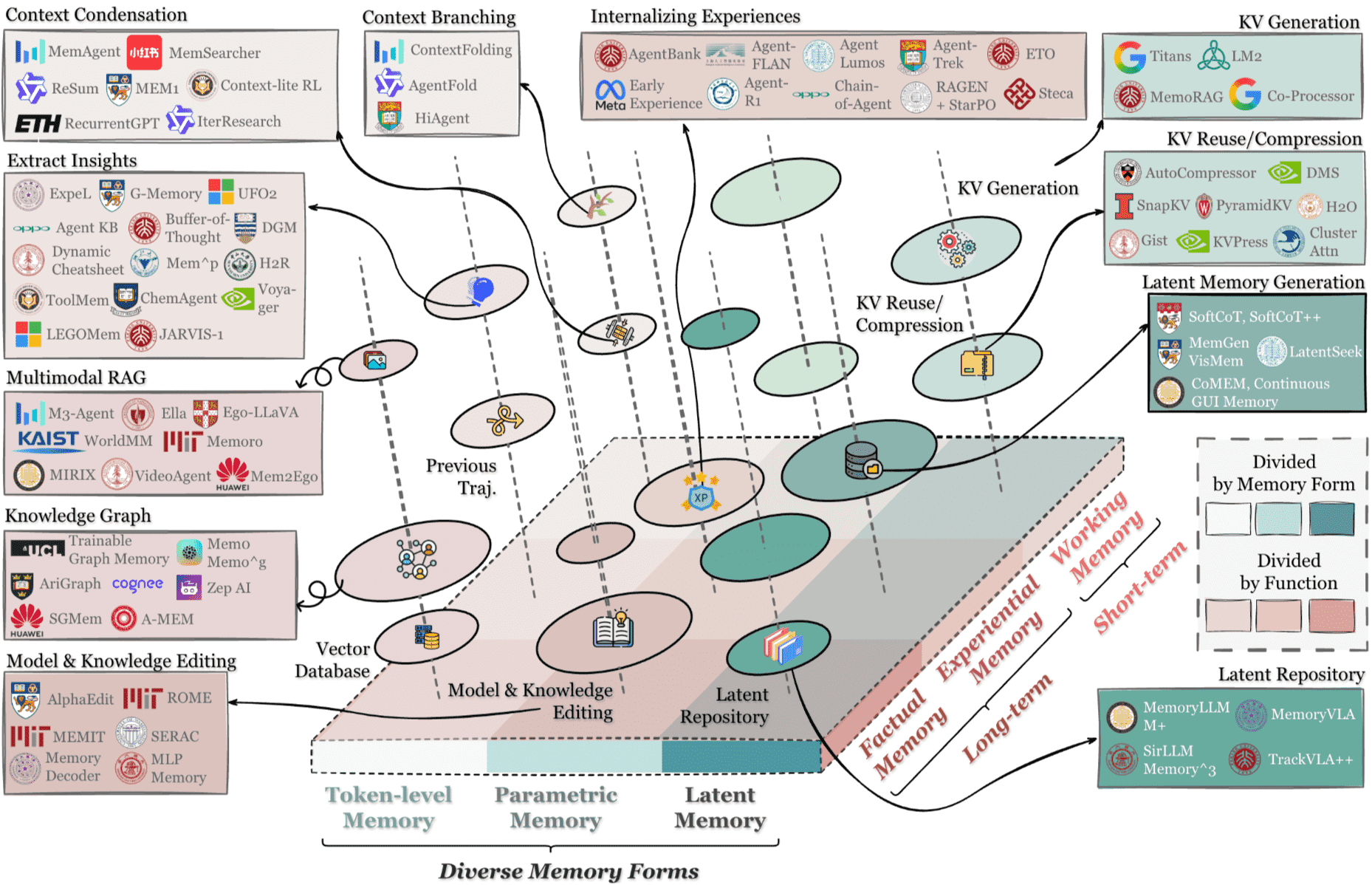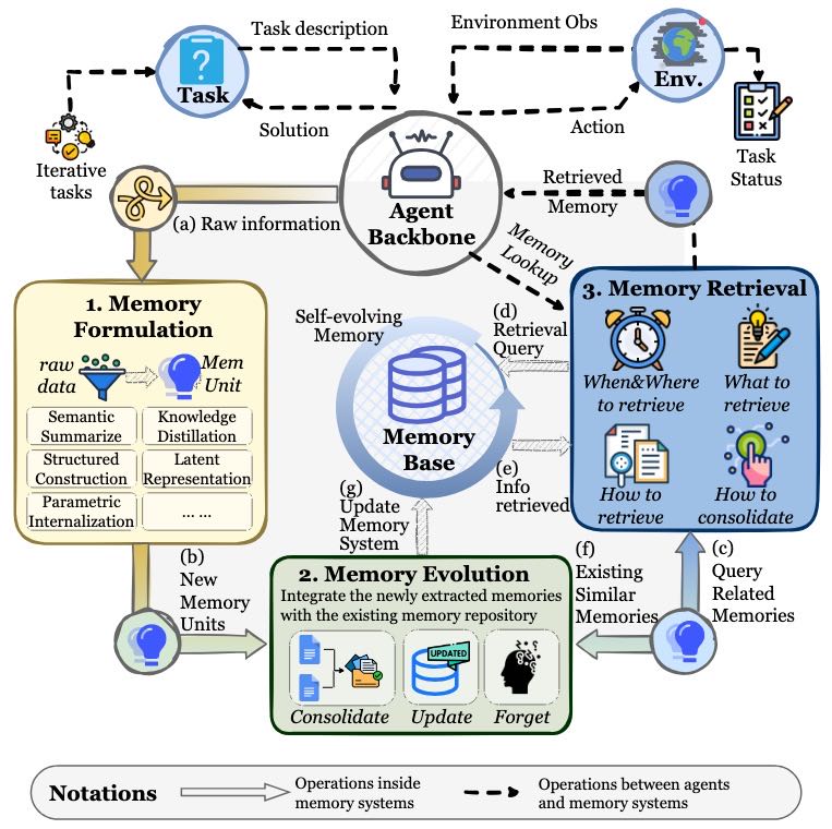 📄 论文从形式(token-level, parametric, latent)、功能(factual, experiential, working memory)和动态(形成、演化、检索)三个统一视角,提供了一套全面的智能体记忆分类体系。