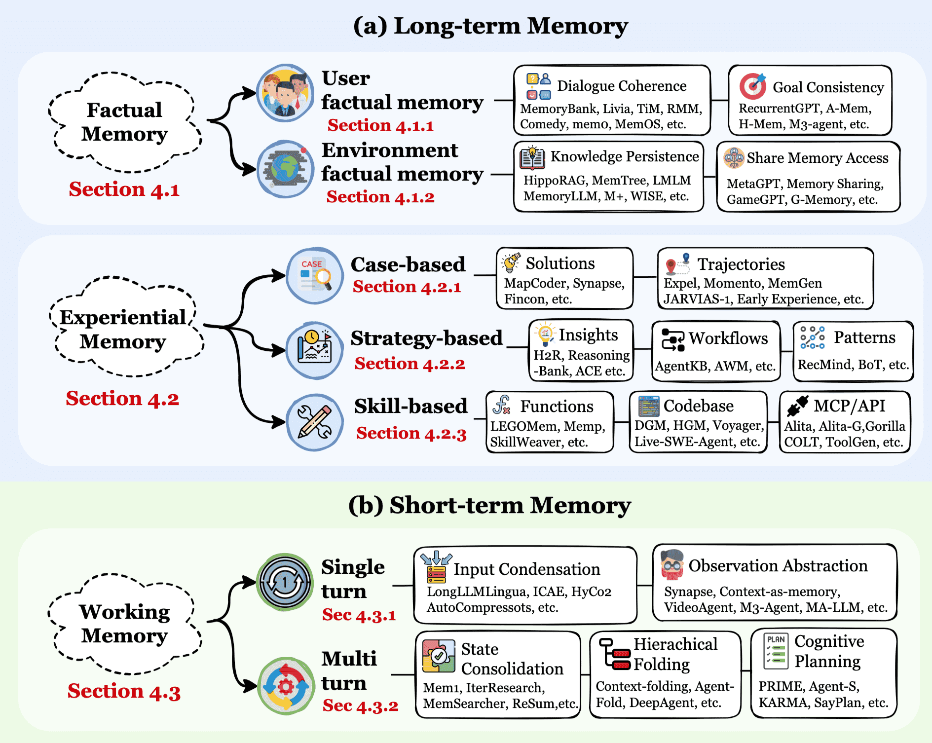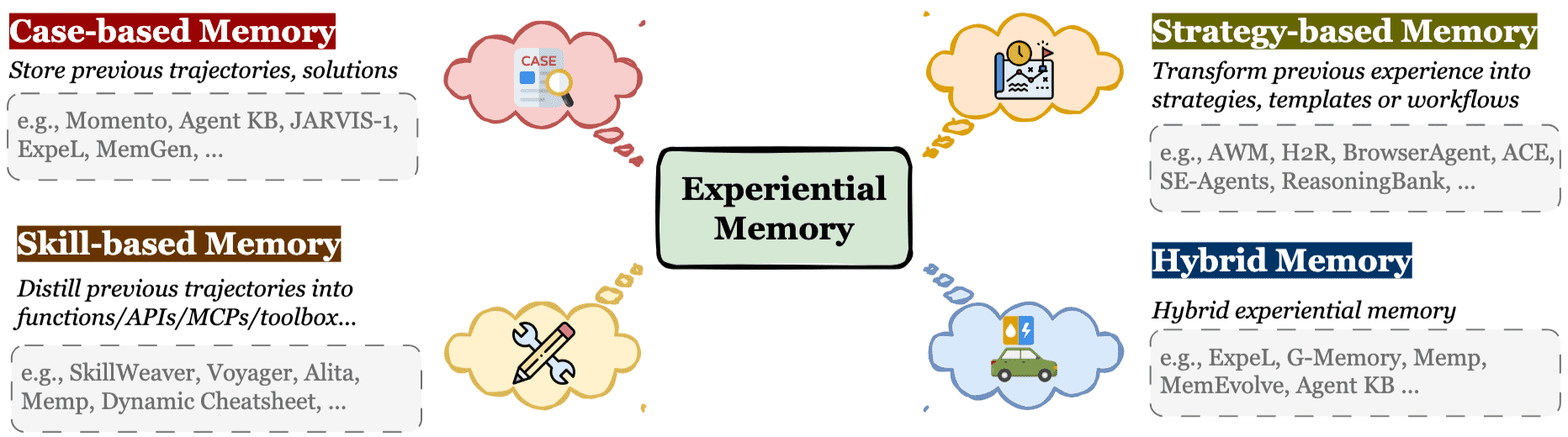 Experiential Memory: Experiential Memory (经验记忆) 指的是代理从过去轨迹、失败和成功中累积的程序性和策略性知识。它的目的是实现持续学习和自我进化,帮助代理提高问题解决能力。它回答“代理如何改进?”的问题。这种记忆通常基于代理的互动经验,通过抽象化和泛化来形成可重用的策略或技能。