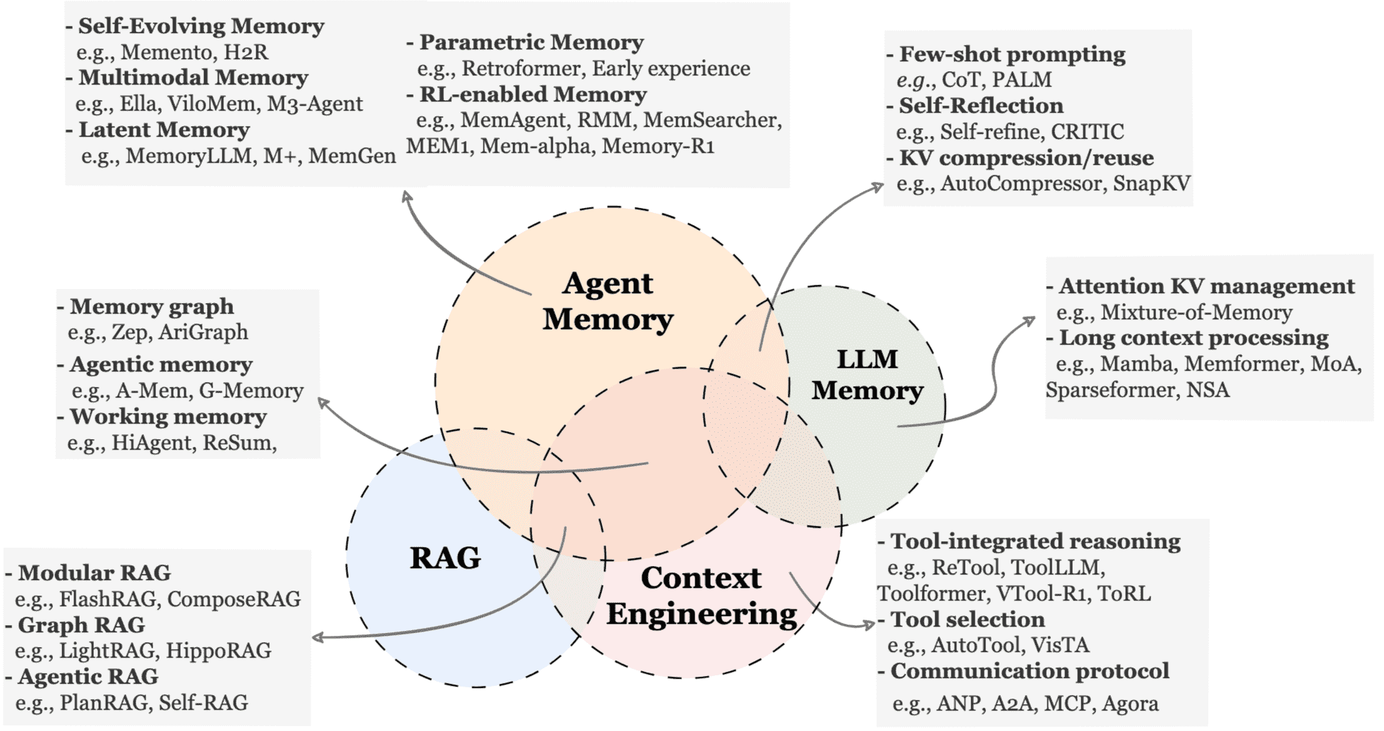 LLM Memory: LLM Memory (LLM记忆) 指的是早期研究中用于描述LLM内部或与其紧密集成的记忆机制的概念,包括管理Transformer的KV缓存、设计长上下文处理机制等。论文认为,在当前更成熟的代理概念下,许多“LLM记忆”实际上属于Agent Memory的范畴。但专门针对模型内部状态优化的工作(如架构修改以支持更长上下文)被视为LLM Memory,而与代理的决策循环和外部状态交互无关。