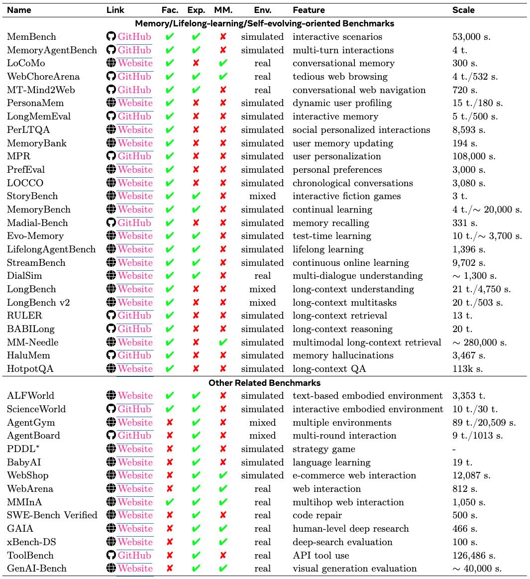 面向多模态智能体: 让智能体能存储和利用来自图像、音频、视频等不同感官输入的记忆。视觉记忆研究最多,音频等其他模态探索较少。