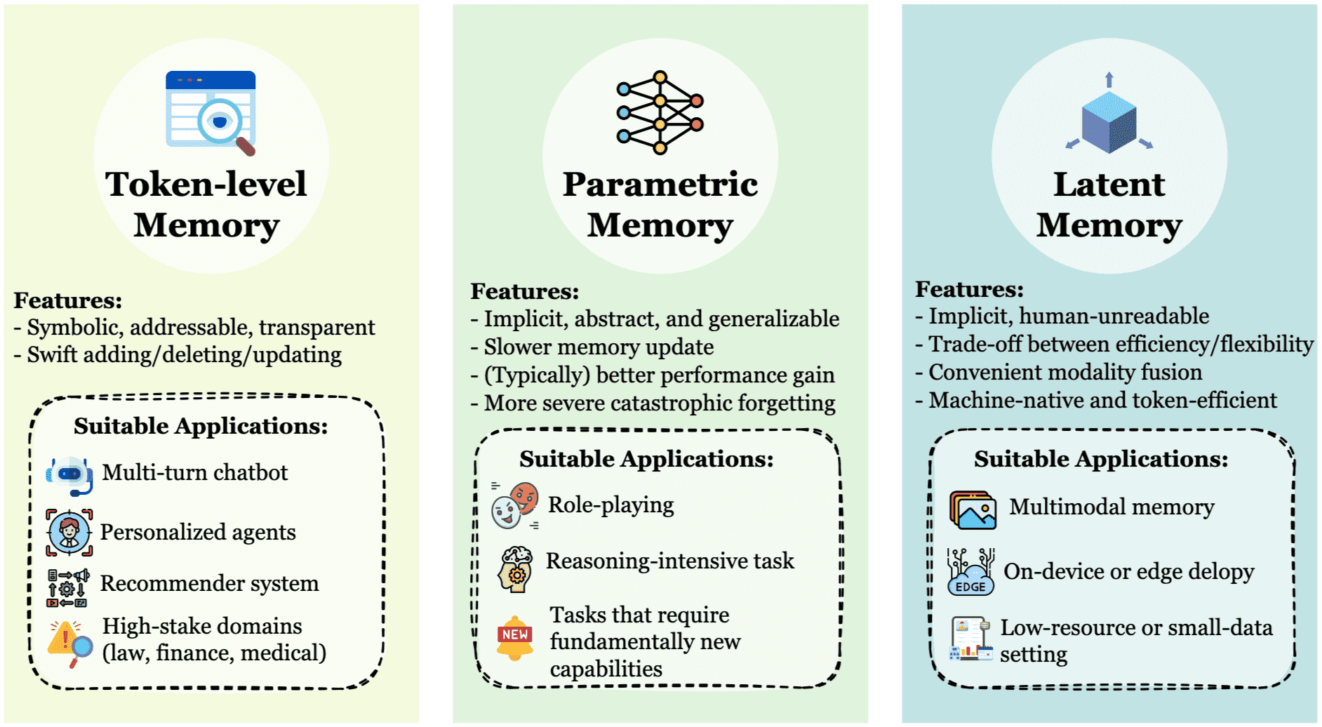 在形式层面,我们识别出三种主要的实现方式:token 级记忆、参数化记忆以及潜在记忆。近年来,这三种形式均经历了各自快速而显著的发展,体现了在表示能力、适应性以及与智能体策略整合程度方面截然不同的权衡取舍。