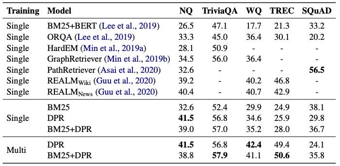 在多个开放领域问答数据集上的评估表明,本文的密集检索器在 Top-20 段落检索准确率上,比强大的 Lucene-BM25 系统高出 9%-19%。此外,该密集检索器还帮助端到端问答系统在多个开放领域问答基准上取得了新的最优性能(state-of-the-art)。