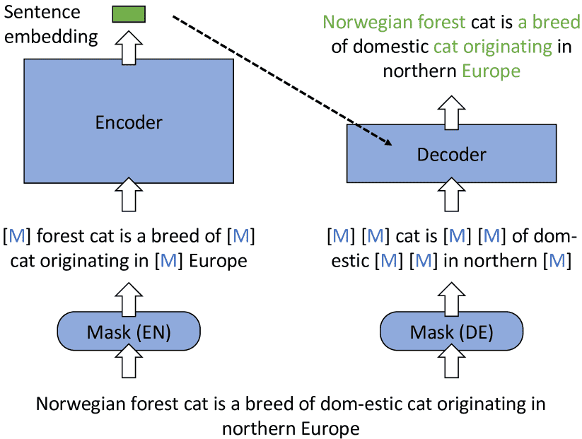 解码器通过这种句子嵌入和另一个掩码输入,利用**掩码语言建模(Masked Language Modeling)**来恢复原始句子