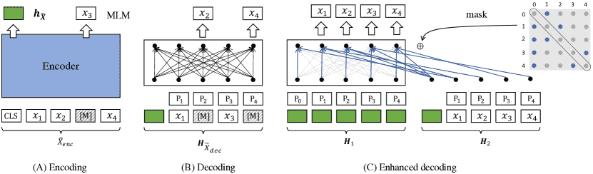 (C) Enhanced encoding: all input tokens are reconstructed based on the sentence embedding and the visible context in each row (defined in Eq. 7); the main diagonal positions are filled with −∞ (grey), and positions for the visible context are filled with 0 (blue).