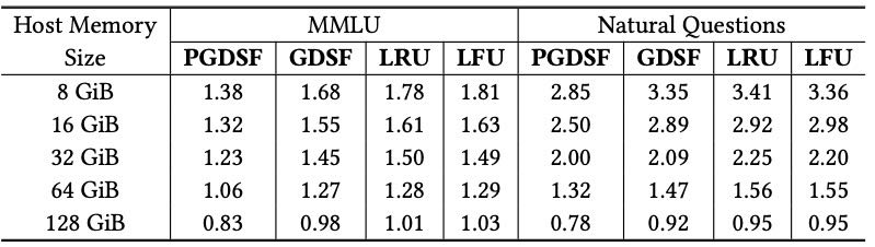 Table 2. Average TTFT (seconds) of different replacement policies with varying host memory size.