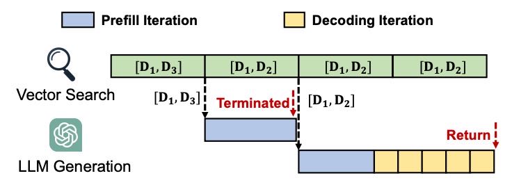 动态推测流水线(Dynamic Speculative Pipelining):将 CPU 上的向量检索和 GPU 上的 LLM 推理重叠执行,以减少端到端延迟。