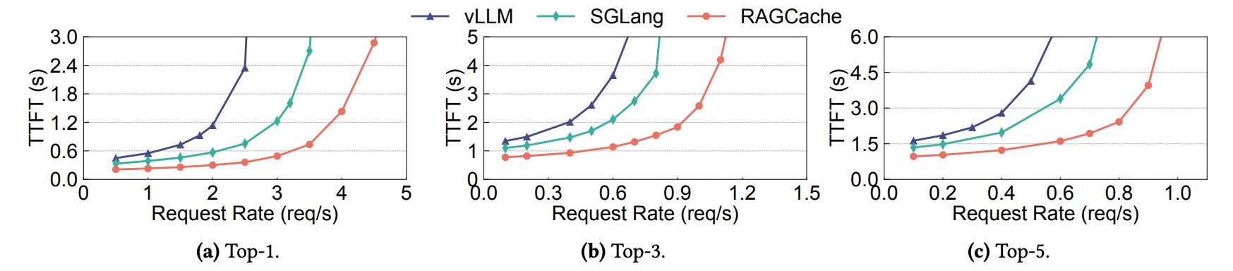 相比 vLLM + Faiss,RAGCache 在**首字生成时间(TTFT)**上快 4倍,吞吐量提升 2.1倍。