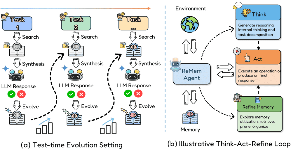 📊 该基准将数据集重构为顺序任务流,要求LLM在每次交互后搜索、适应和演化其记忆,并引入了ExpRAG基线和ReMem(action–think–memory refine)管道来促进持续改进。