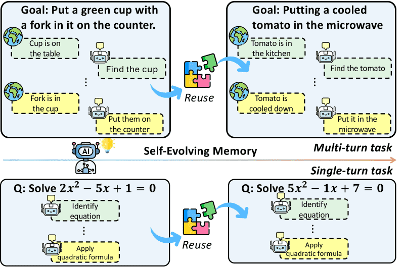 问题陈述: 尽管 LLM 已在推理、规划和工具使用方面取得显著进展,但其记忆管理和进化能力仍未被充分探索。现有系统多停留在“Conversational Recall”(对话回忆),即被动地从对话中检索信息来回答查询,而非“Experience Reuse”(经验重用),即从积累的交互中学习以改进未来的推理或决策。这导致 LLM Agent 在处理连续任务流时常无法从过往经验中学习,失去宝贵的上下文洞察力。