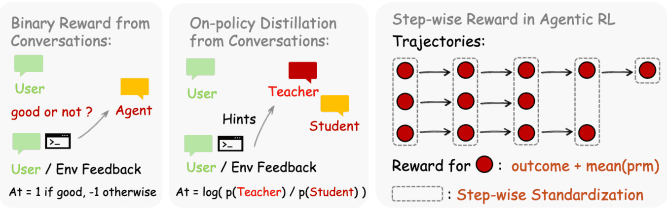 它能够将个人对话、终端执行、GUI 交互、软件工程(SWE)任务和工具调用等多种异构交互流,同时 作为实时、在线的学习来源,用于训练同一个策略。